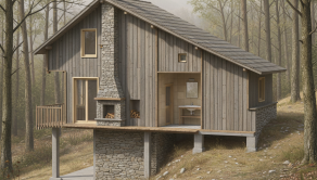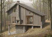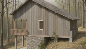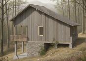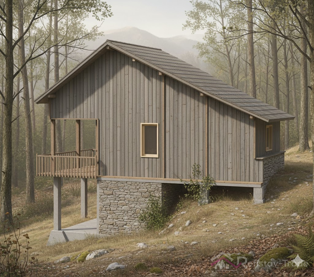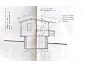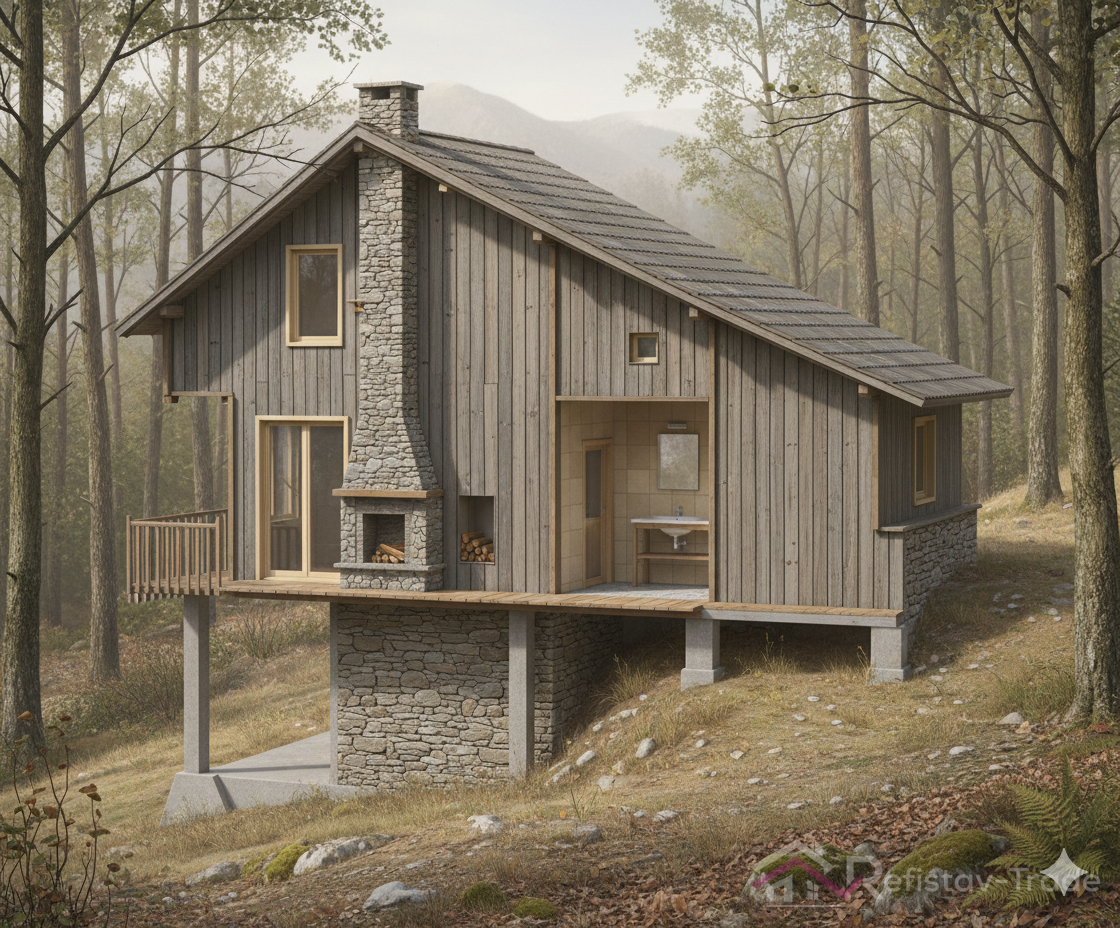 Súčasťou fotografií je aj vizuál, ako by mohla vyzerať chatka po renovácii podľa projektovej dokumentácie.