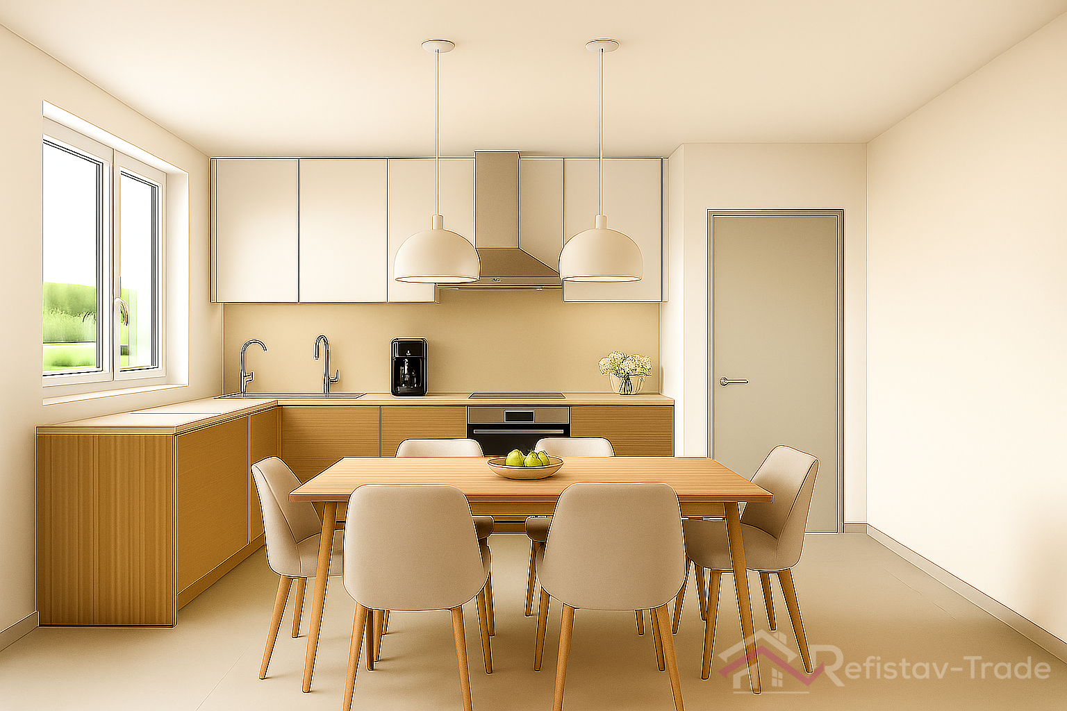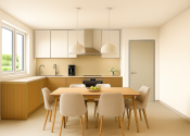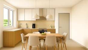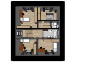 - Priestranná obývacia izba prepojená s jedálňou a kuchyňou