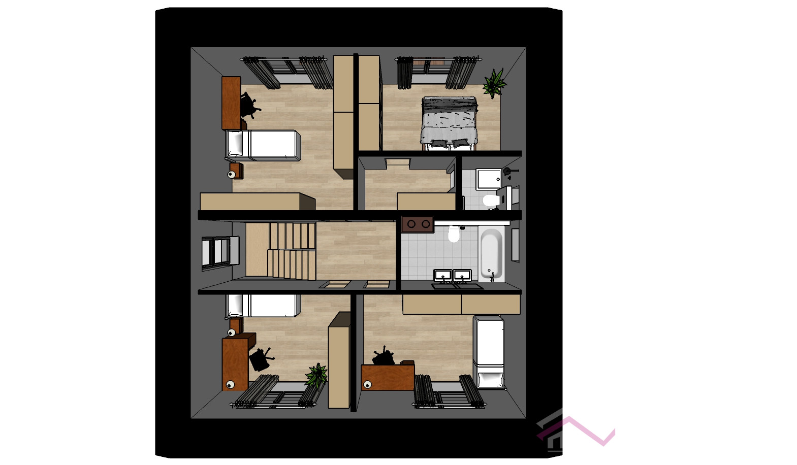 - 2 kúpeľne, jedna s vaňou a dvomi umývadlami