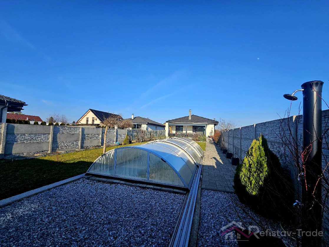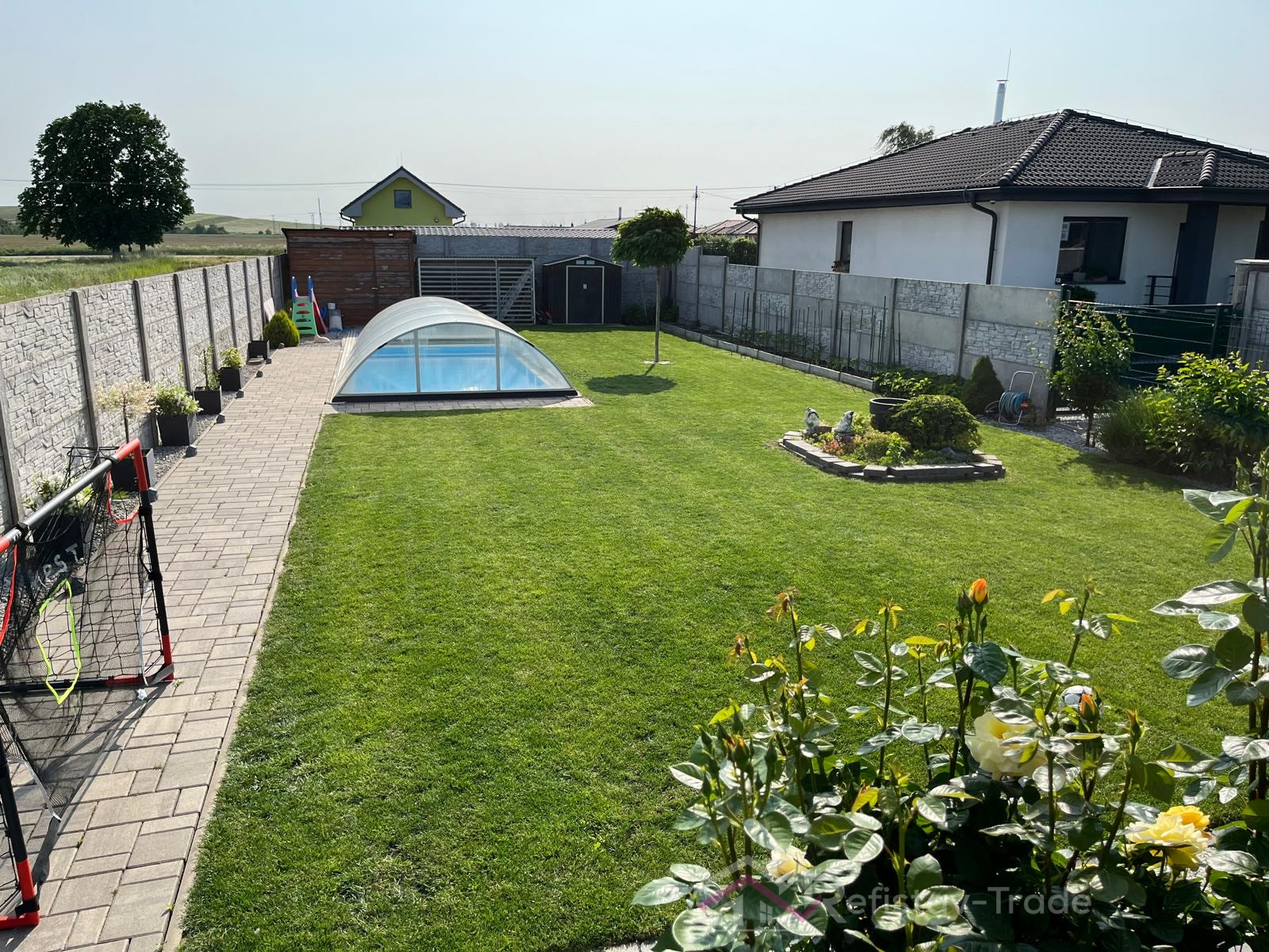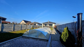Pozemok je rovinatý, oplotený a ideálnej veľkosti – poskytuje dostatok priestoru na oddych, bazén, rodinné aktivity, no zároveň nie je náročný na údržbu.
